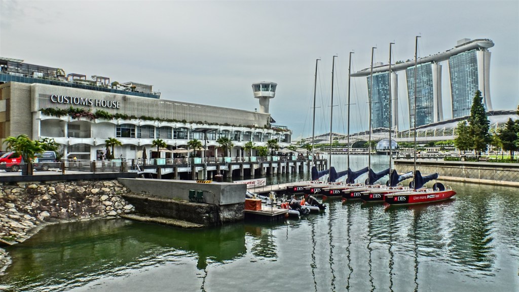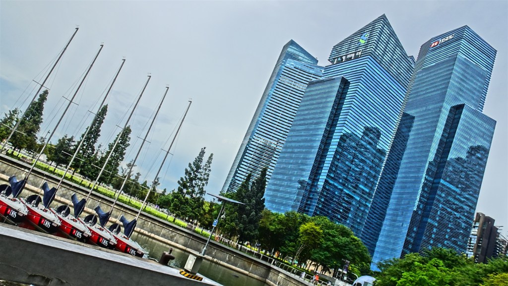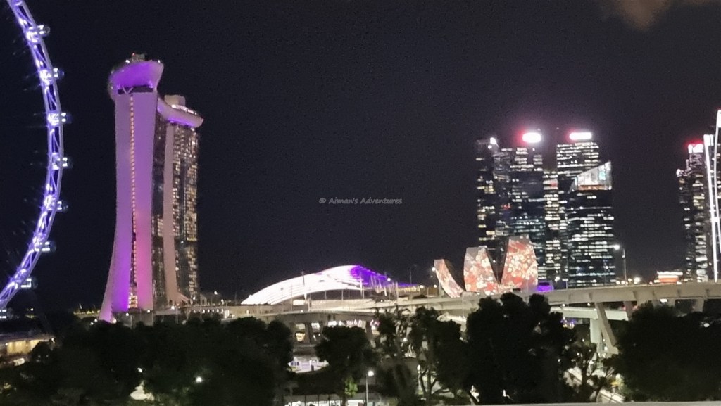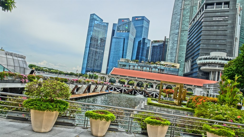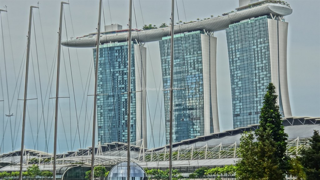 The waterfront area featuring the amazing Marina Bay Sands (buildings with connected rooftop terrace)